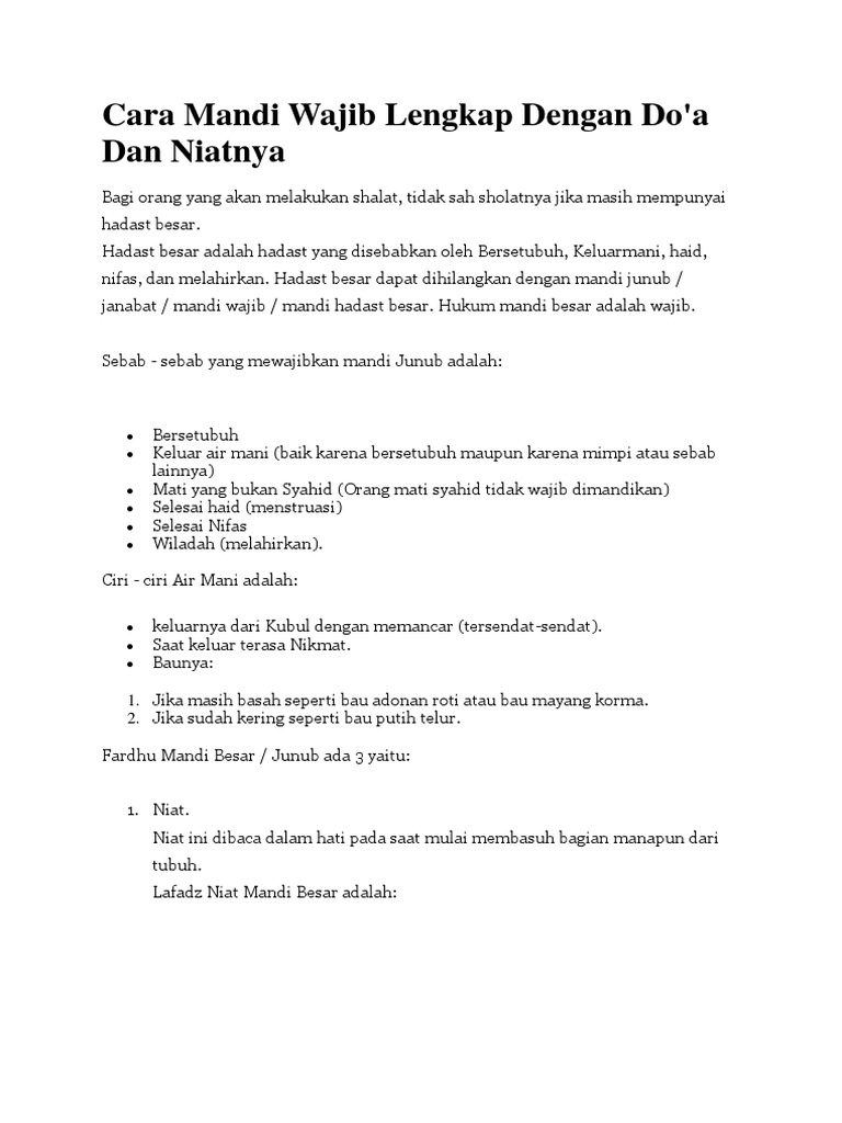Mandi junub adalah ritual yang wajib dilakukan jika terjadi beberapa hal. Tata cara yang disunnahkan ketika mandi dari aisyah radhiyallahu anhuma, ia berkata, dahulu, jika rasulullah shallallahu 'alaihi wa sallam tidak wajib melepas ikatan rambutketika mandi haid sebagaimana tidak wajib melepasnya ketika mandi janabah. Adapun ketika melakukan mandi ini, seseorang diharuskan untuk melafalkan niatnya dengan baik dan benar. Namun, perbedaan ini hanya terletak pada. Larangan ini bagi wanita haid dan nifas. Dimulai dengan niat mandi wajib. Allah subhanahu wa ta'ala berfirman Islam mengenal adanya mandi wajib atau biasa disebut mandi junub yang biasanya dilakukan setelah berhubungan badan, masa haid, atau setelah nifas. Nawaitul ghusla liraf'il hadatsil akbari fardhan lillah ta'alaa. Oleh itu, di bawah adalah panduan ringkas tentang cara mandi wajib yang boleh anda ikuti yang dikeluarkan oleh jabatan kemajuan islam (jakim) tentang kemusykilan akan cara mandi wajib yang sebenarnya. Mengapa seseorang harus mandi wajib? Aku niat mandi wajib untuk mensucikan hadas besar dari nifas karena allah ta'ala. Mati, dan matinya itu bukan mati syahid.