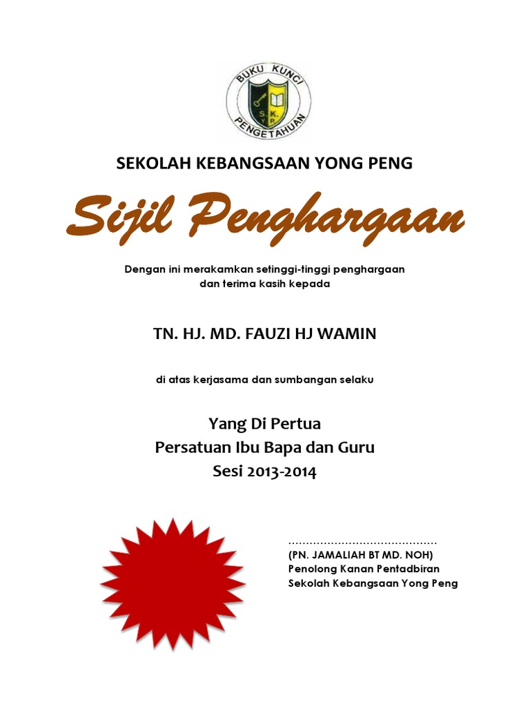 Contoh Sijil Penghargaan Ajk Pibg / Contoh surat keterangan penghasilan /gaji dan tanggungan keluarga dari kelurahan.. Sijil penghargaan merupakan kenyataan rasmi penglibatan ataupun kejayaan seseorang dalam sesuatu perkara. Cara mudah membuat desain sertifikat piagam penghargaan dengan powerpoint. Contoh presentasi powerpoint yang bagus untuk sidang skripsi tesis disertasi. Pendidikan moral kod kertas : Unduh atau download contoh format piagam penghargaan untuk kejuaraan lomba maupun kegiatan osis, juara kelas pramuka, olahraga futsal maupun dalam bentuk kosong, tinggal edit isi sesuai dengan yang diperlukan dalam format doc ms word office.