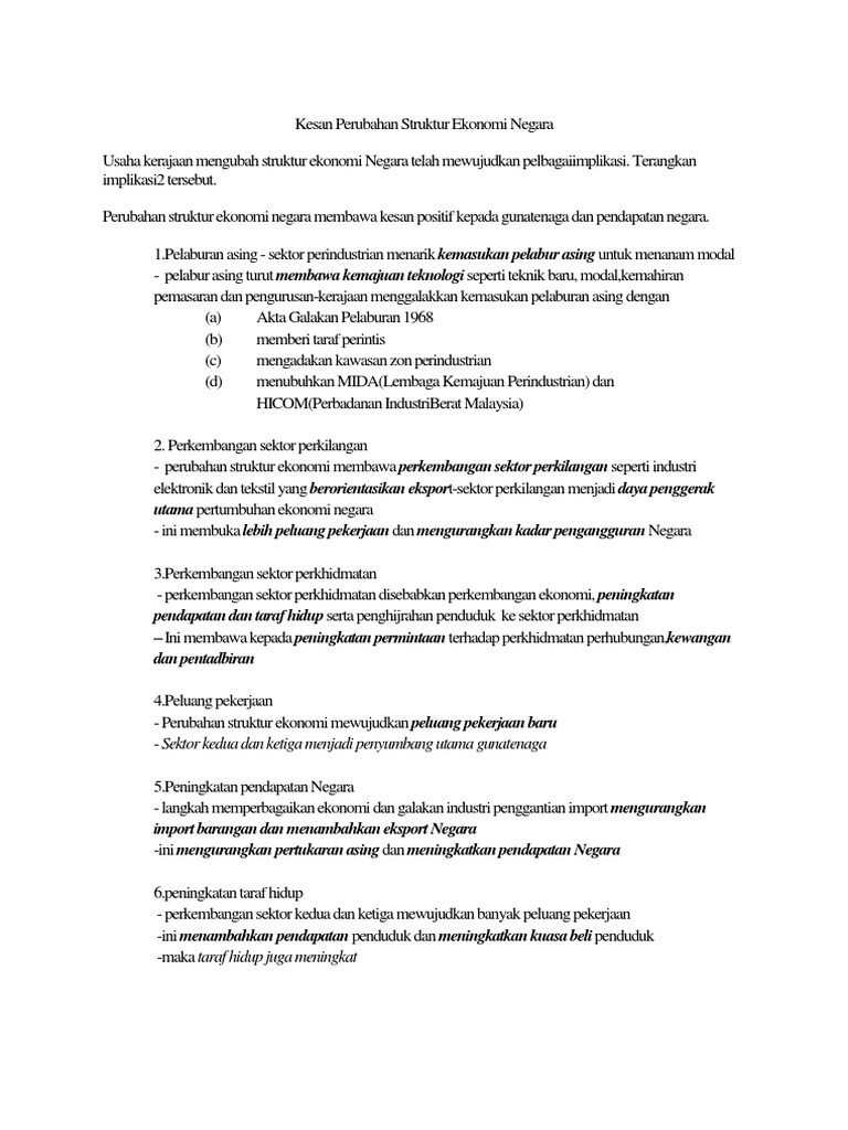 Penguncupan pramatang industri (premature deindustrialisation) dalam ekonomi malaysia menyebabkan struktur ekonomi semakin bergantung kepada tenaga buruh, pekerja kurang mahir dan. 10 perubahan struktur ekonomi pembangunan ekonomi jangka panjang dengan pertumbuhan pdb atau pn akan membawa suatu perubahan mendasar dalam struktur ekonomi: Menganalisis kesan perubahan struktur ekonomi terhadap guna tenaga dan pendapatan negara malaysia. Oleh itu kegiatan penanaman getah dan perlombongan bijih timah telah diberi. Berikut ini soal ekonomi tentang pertumbuhan ekonomi, perubahan struktur ekonomi, dan krisis ekonomi.